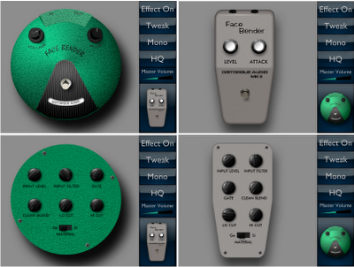 El verde y redondo -Face Bender- es la versión virtual de un Fuzz Face pedal de los 60´s y su sonido suena a retro y a psicodelia... utilizado por Hendrix, Gilmour y Clapton.